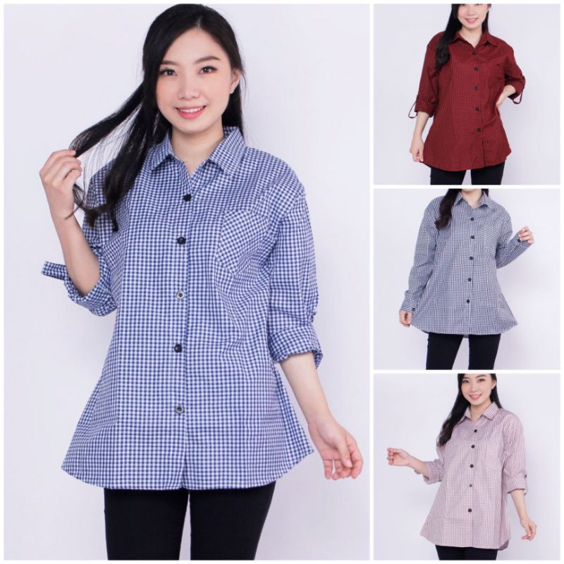 Kemeja Wanita Basic Lengan Panjang Katun Kotak Trendy/ Atas Wanita