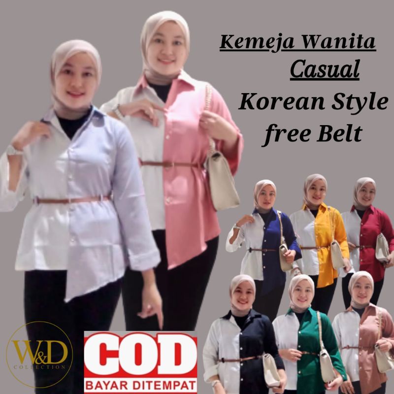 BLOUSE LOVELY TOP ATASAN KEMEJA WANITA POLOS KOMBINASI 2 WARNA CASUAL KOREA LENGAN PANJANG MOSCREPE FREE IKAT PINGGANG