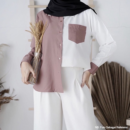 Kemeja Wanita Atasan Blouse Casual Polos Kombinasi Warna Lengan Panjang Model Pinguin Bahan Moscrepe