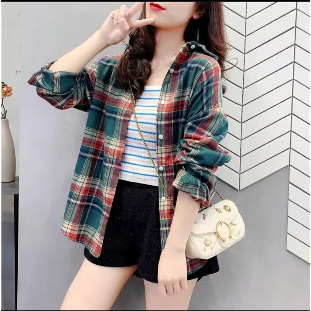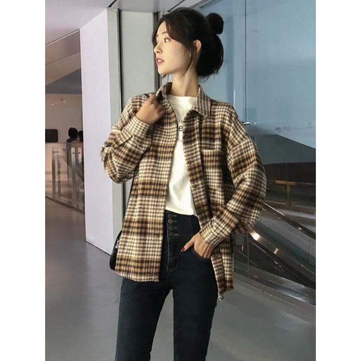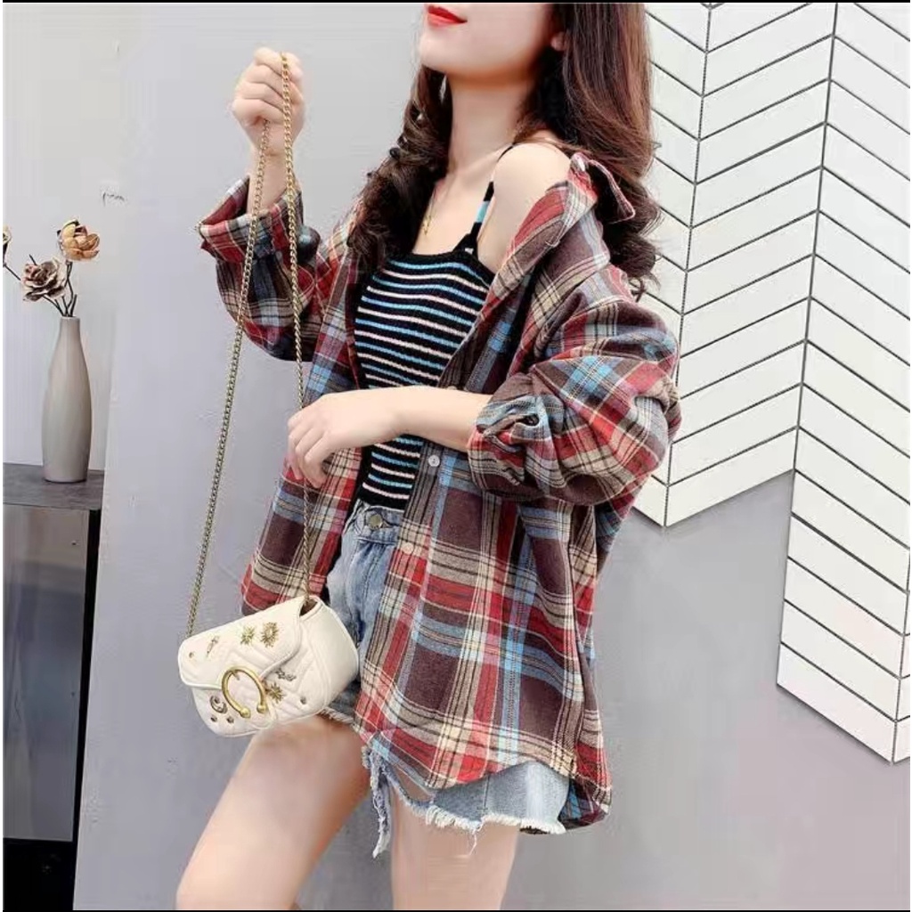 Harga Kemeja flanel Kotak Kotak Kemeja Oversize/model Longgar Hitam Kemeja Wanita Casual/Kemeja